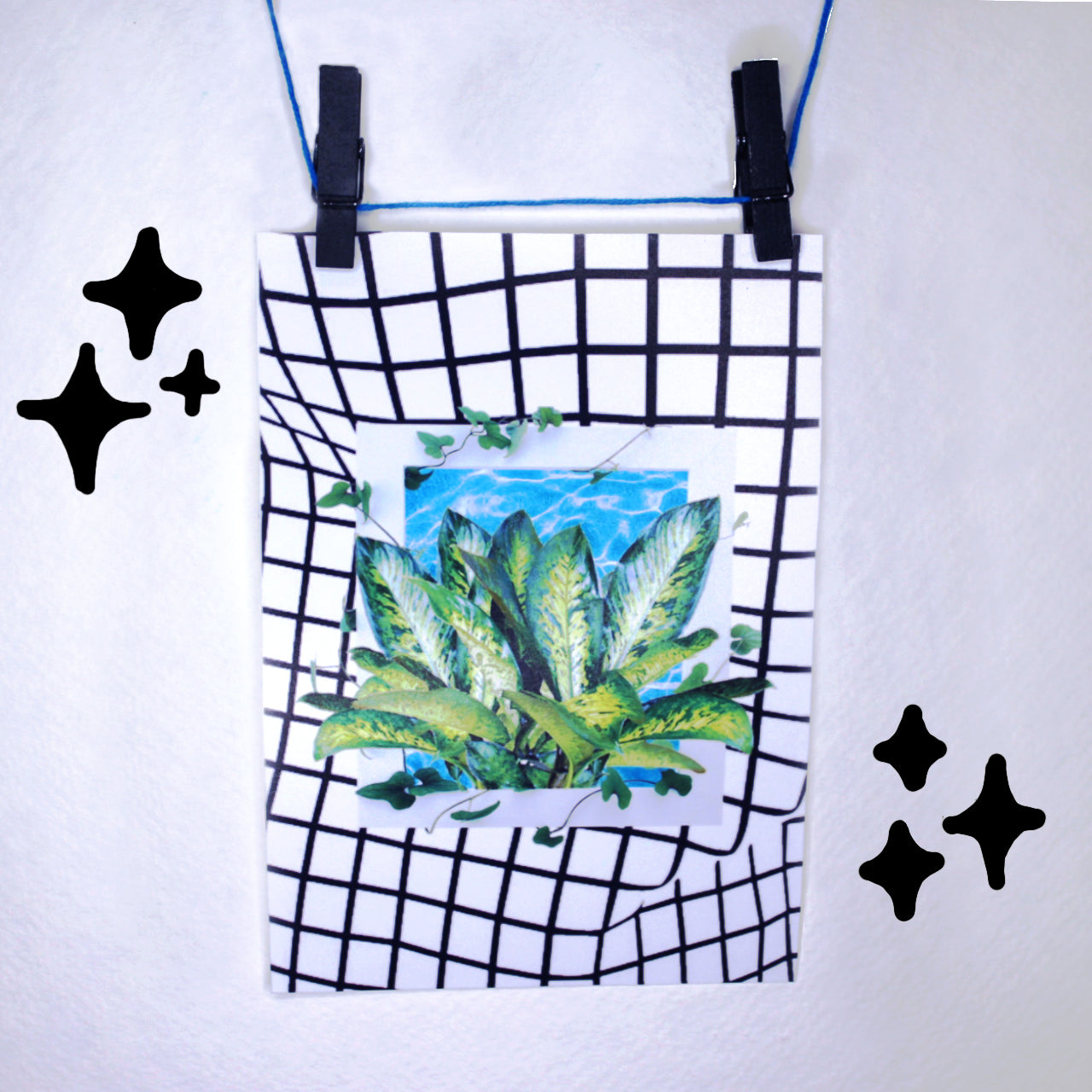 This 4" by 5 1/2" mini art print is the size of a postcard and will add a dash of vaporwave vibes to your fridge, office area, or walls. Featuring a lush green plant nestled in a vibrant blue pool, this design adds a nice pop of color to any space.