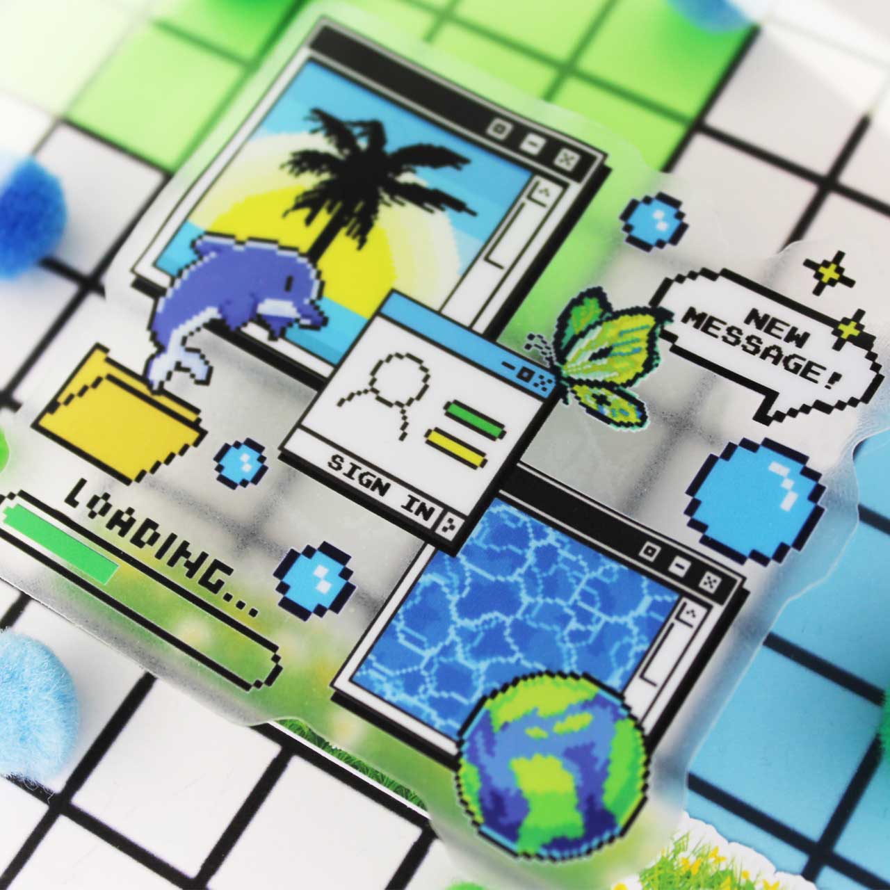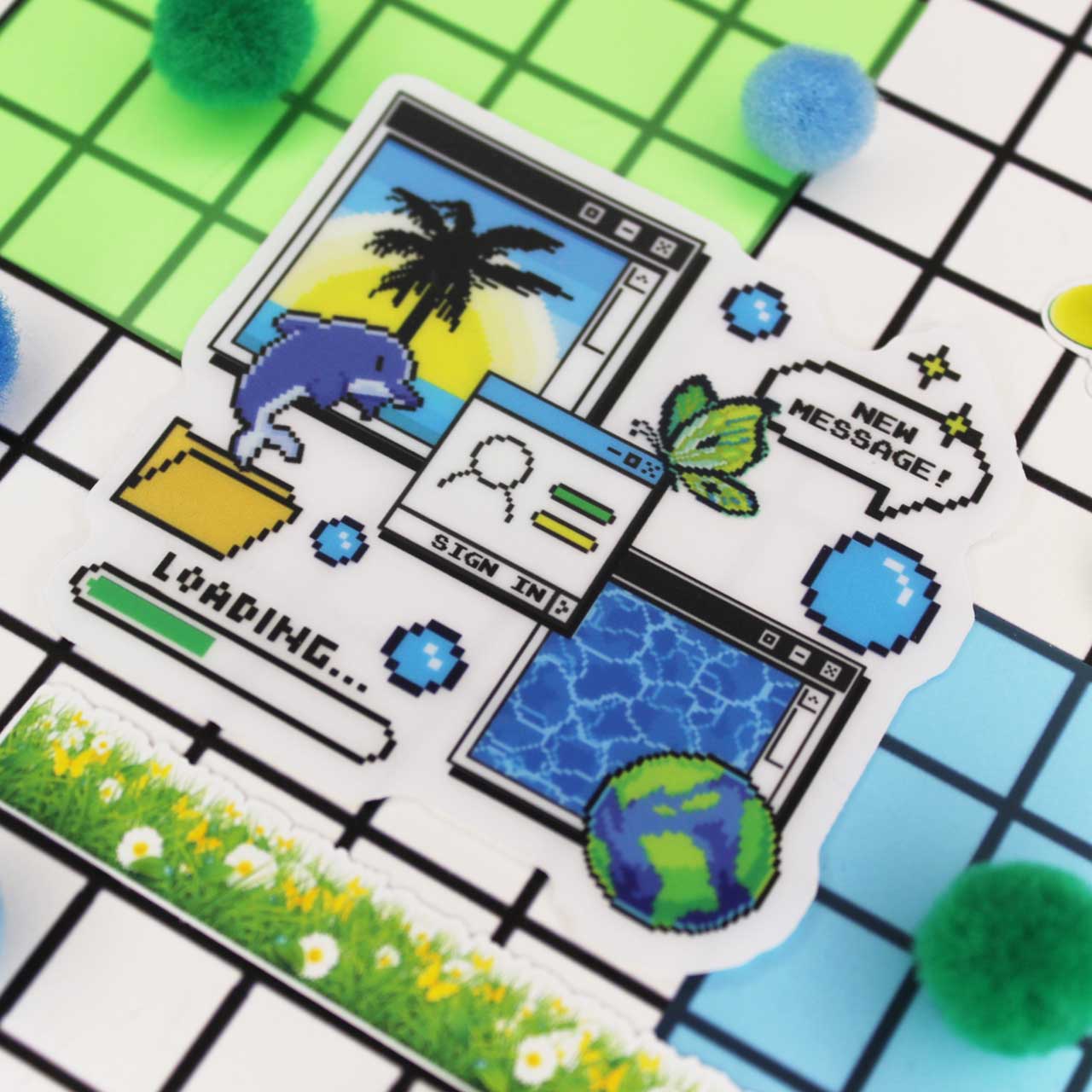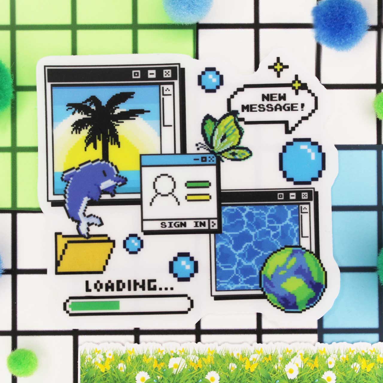 A pixel art take on frutiger aero. This clear sticker is fully waterproof and measures 3.0" x 2.8"