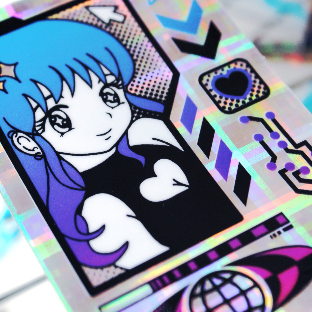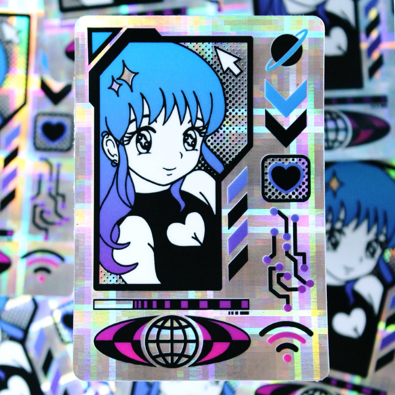 Cyber kawaii holographic anime girl sticker resembles a futuristic internet cafe card with a touch of Y2K aesthetic. She is water resistant and measures 2.5"x 3.5"