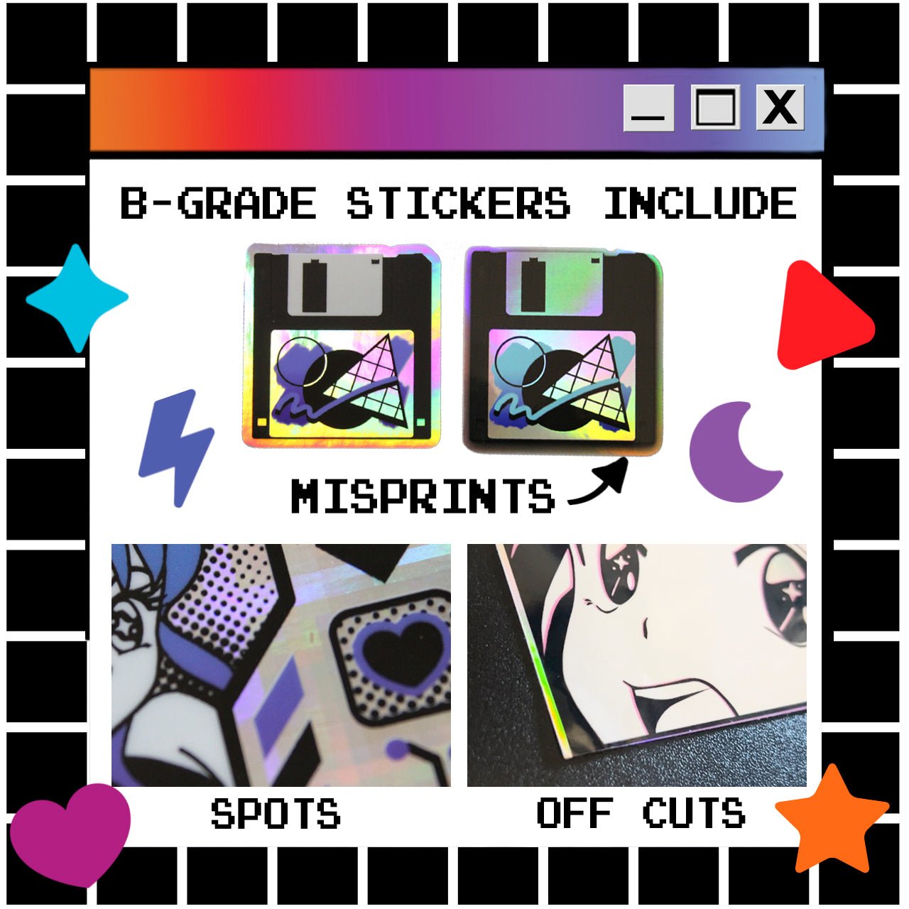 4 randomly picked, b-grade holographic stickers in one pack. If you don't mind small imperfections like misprints, misaligned cuts, and little spots you can save $ when you get this surprise oops pack.