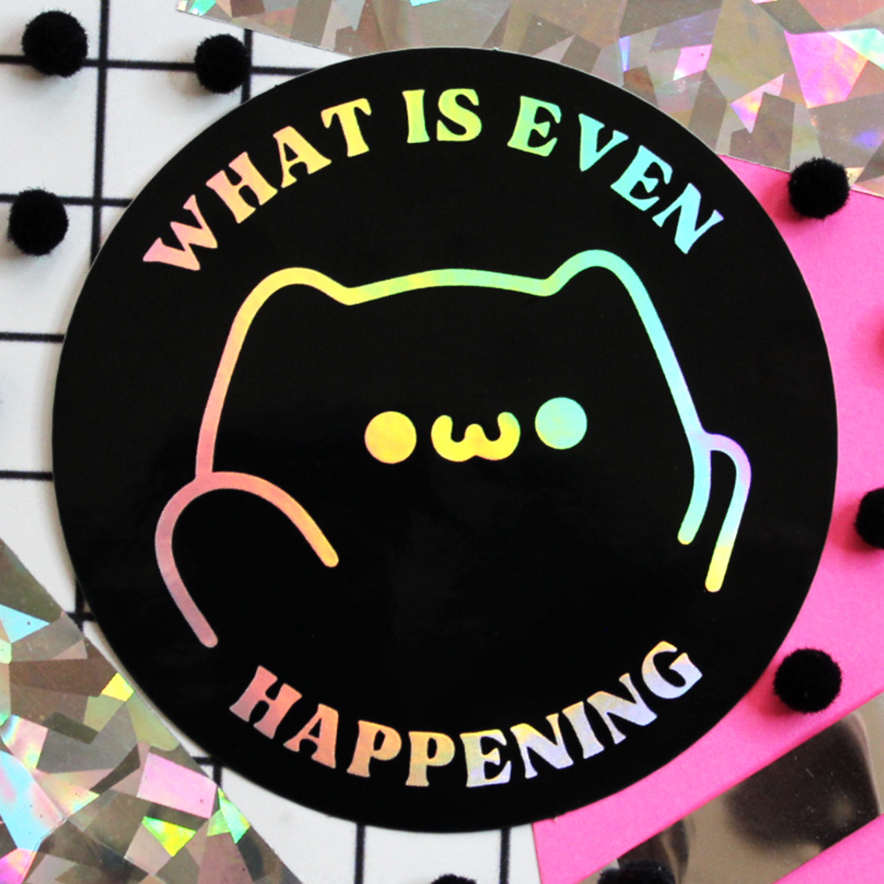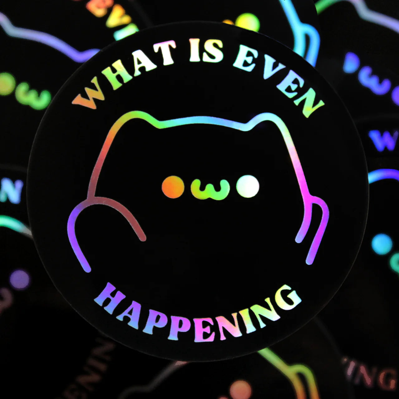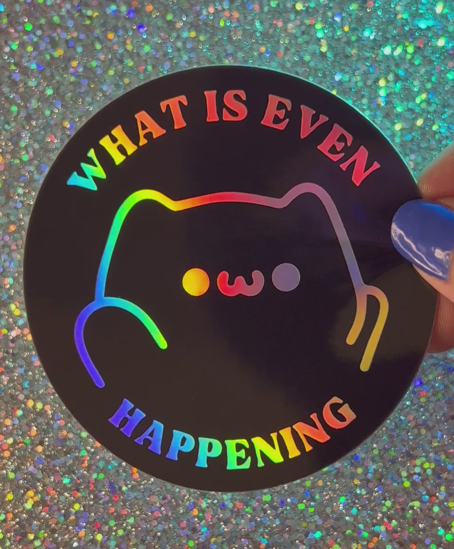 This is a fun and quirky sticker has a holographic design of a confused cat. The cat is both humorous and relatable, capturing the feeling of confusion and bewilderment that we often experience in our daily lives.