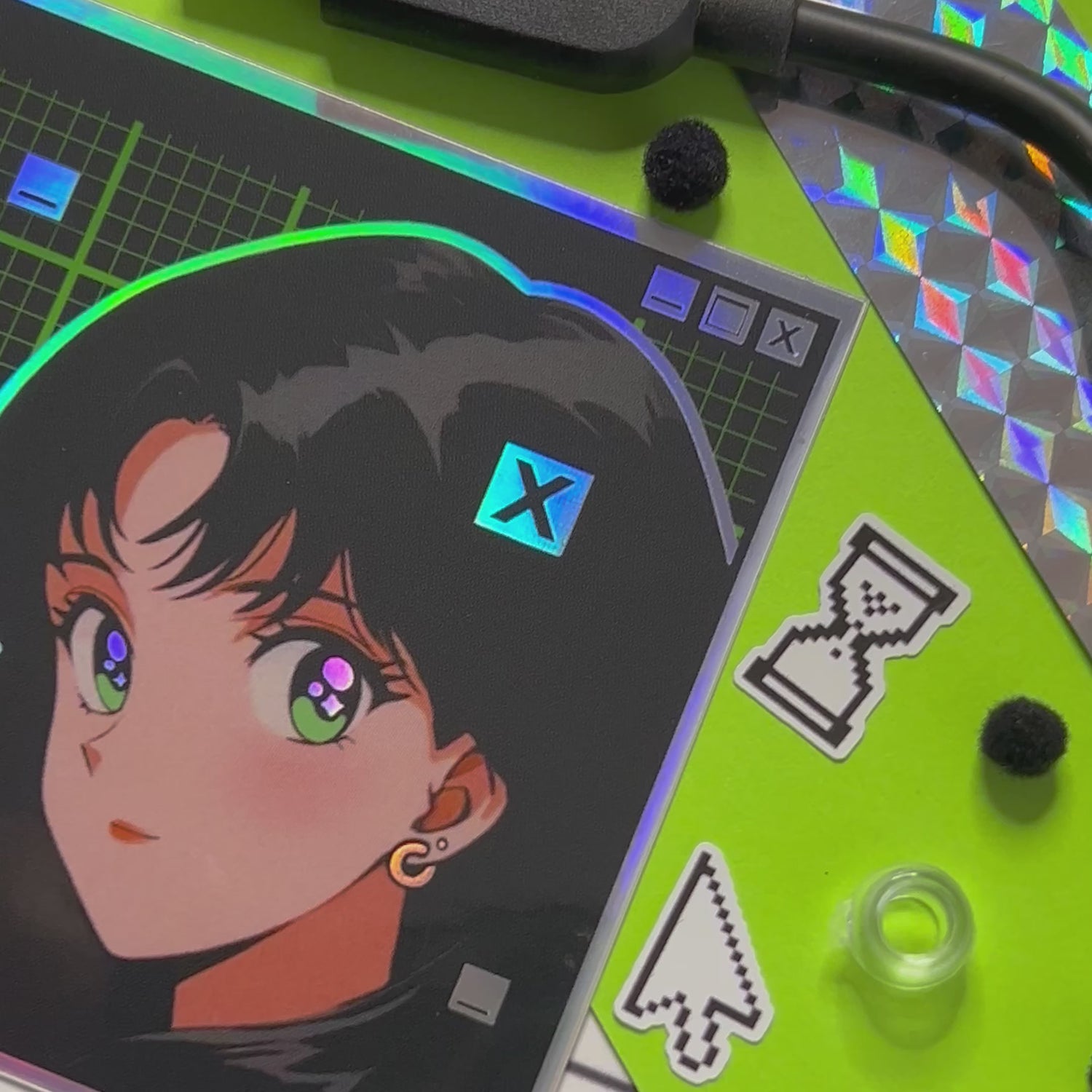 Retro anime girl sticker with a green internet grid background and holographic UI web elements. Slap it onto almost any surface to add some cybercore aesthetic to your belongings ☆